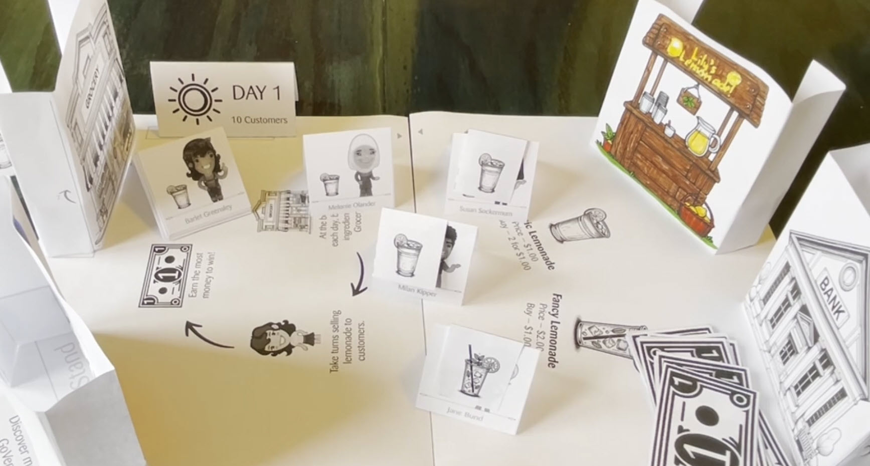 Discover and practice entrepreneurship, creativity, math, and more with this print, build, and play activity for young children ages 5 to 12. One or more players color, cut, fold, build, and play a fun lemonade stand game.